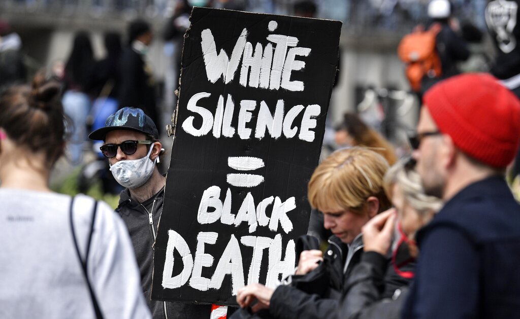 A man holds a sign reading "white silence = black death" as thousands of people demonstrate in Cologne, Germany. (AP Photo/Martin Meissner)