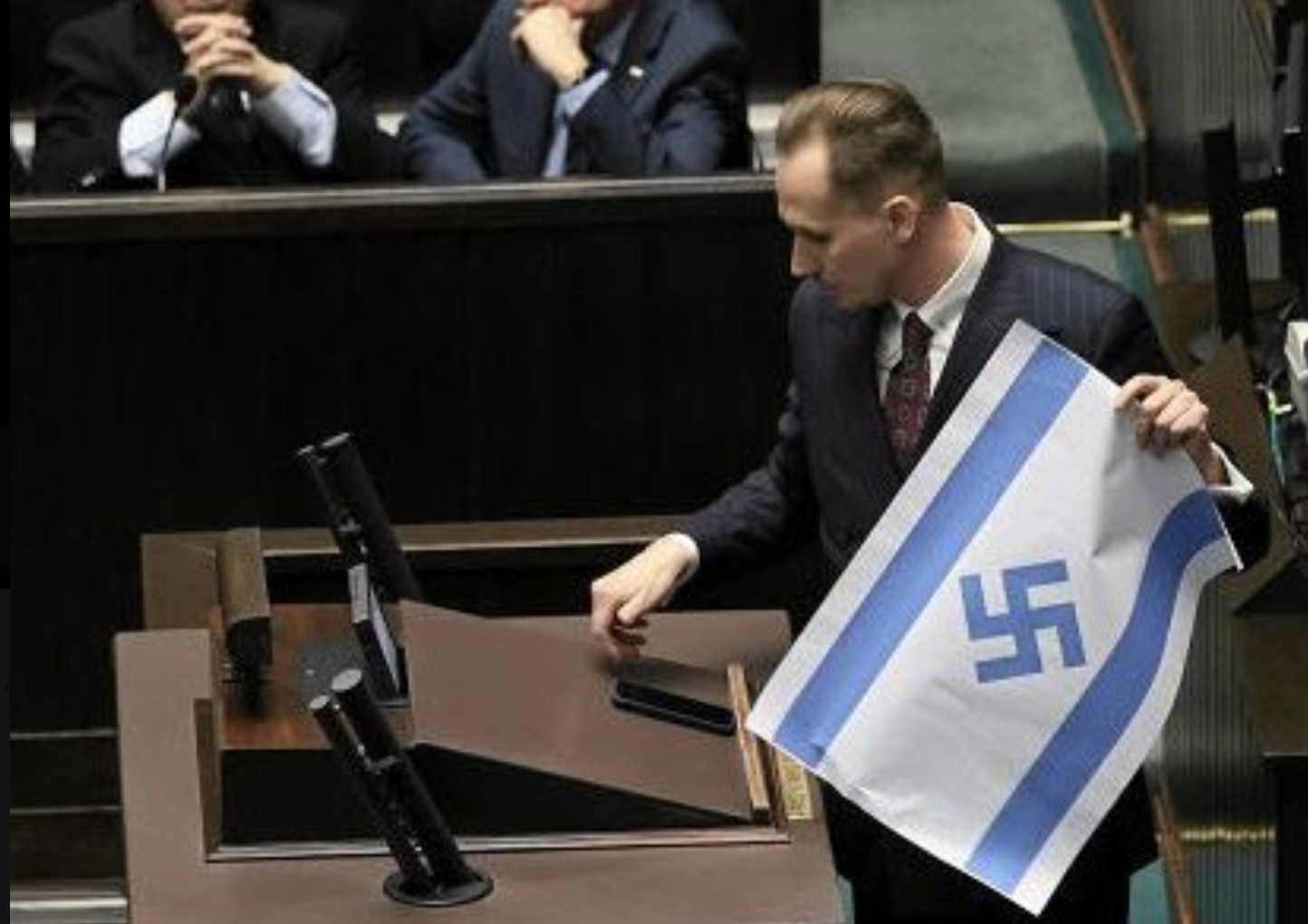 “Israel is committing genocide before our eyes with particular cruelty,” the Confederation MP said openly. At the end of his speech, during the formal motion, the parliamentarian held out an Israeli flag, which featured a swastika incorporated into the Israeli flag instead of the Star of David.