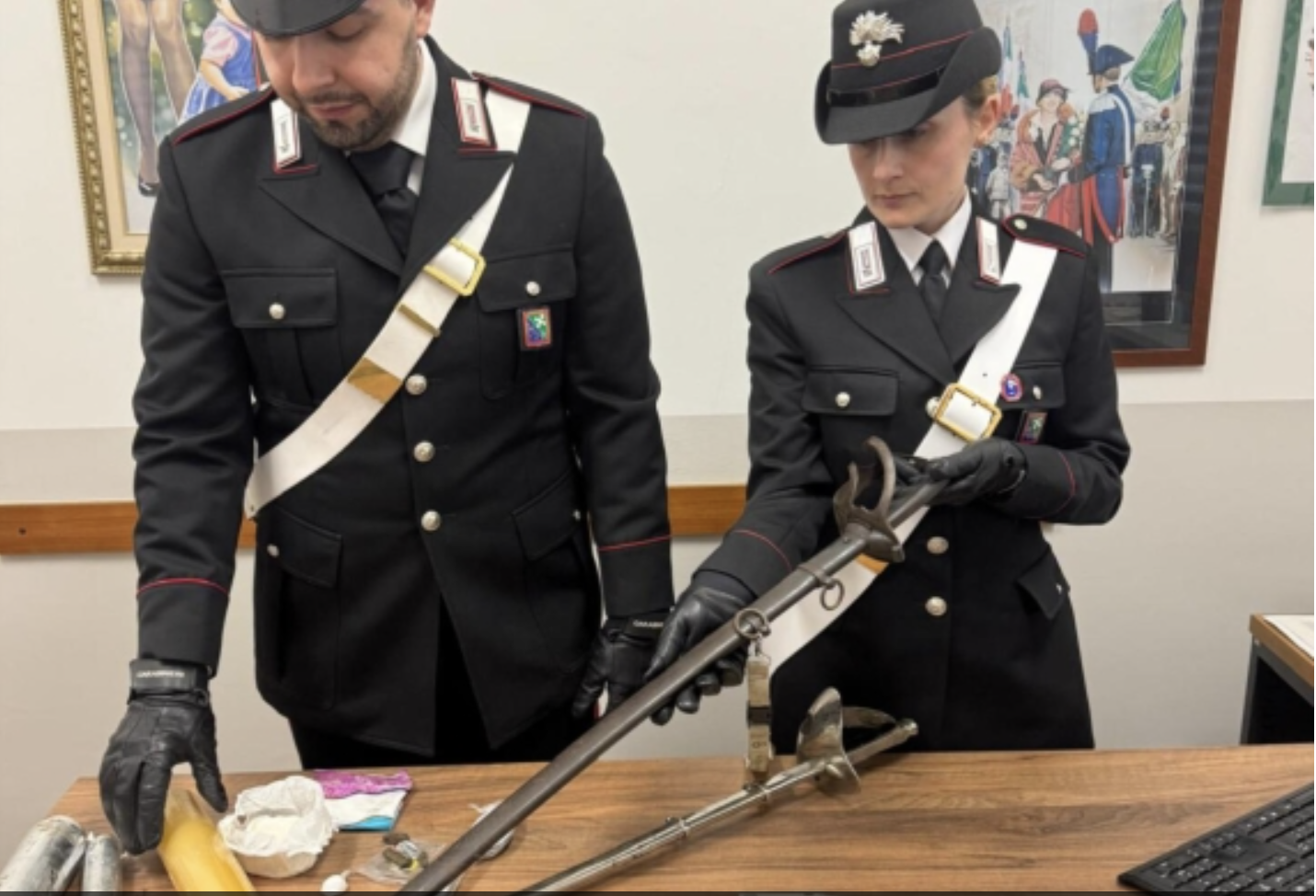 On Saturday evening, officers visited the suspect’s home in Bottanuco and found him there along with 82 grams of cocaine, 10 grams of hashish, packaging materials, and €730 in cash believed to be proceeds from drug dealing. Also recovered were two sabers, each approximately one meter long, one of which is believed to have been used to beat the victim. The woman’s jeans and leather jacket were still on the floor — the trousers bore biological traces consistent with semen. The man was arrested on the spot.