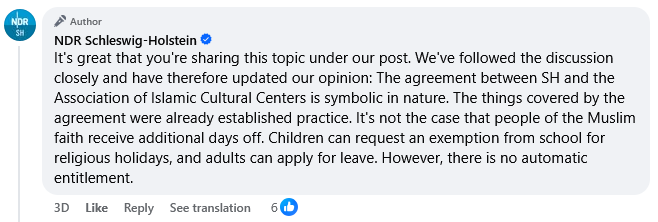 Initial confusion about whether or not the agreement was leading to new public holidays exclusively for Muslims was addressed by NDR in an additional comment under its Facebook story.